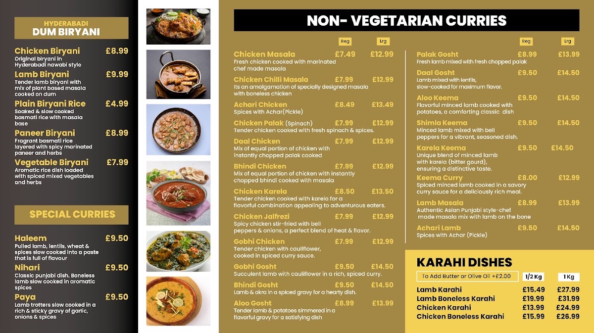 What truly defines Punjabi Dera, however, is its rich selection of traditional curries and mains. Premium dishes like Nihari, Paya, and Haleem sit proudly next to robust chicken options including Chicken Masala, Chicken Chilli Masala, Chicken Palak, 1kg Chicken Karahi, and 1kg Chicken Olive. Lamb lovers will appreciate choices such as Dal Gosht, Palak Gosht, Lamb Masala, 1kg Lamb Karahi, and 1kg Butter Lamb Karahi, while vegetarians are not overlooked with comforting dishes like Dal Masala, Bhindi, Punjabi Channey, and Masala Rice.