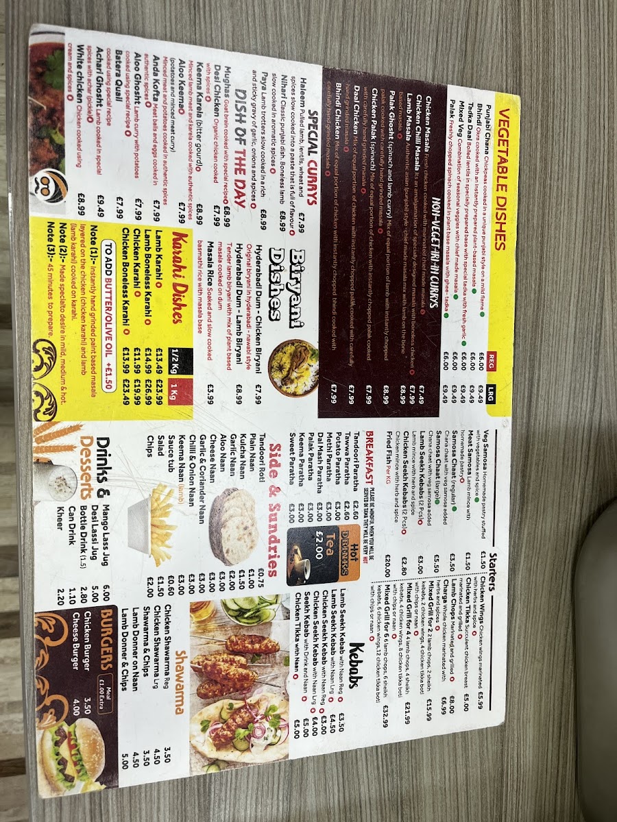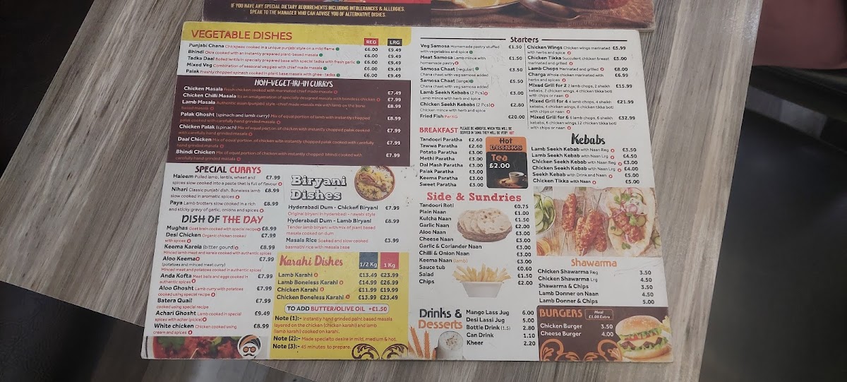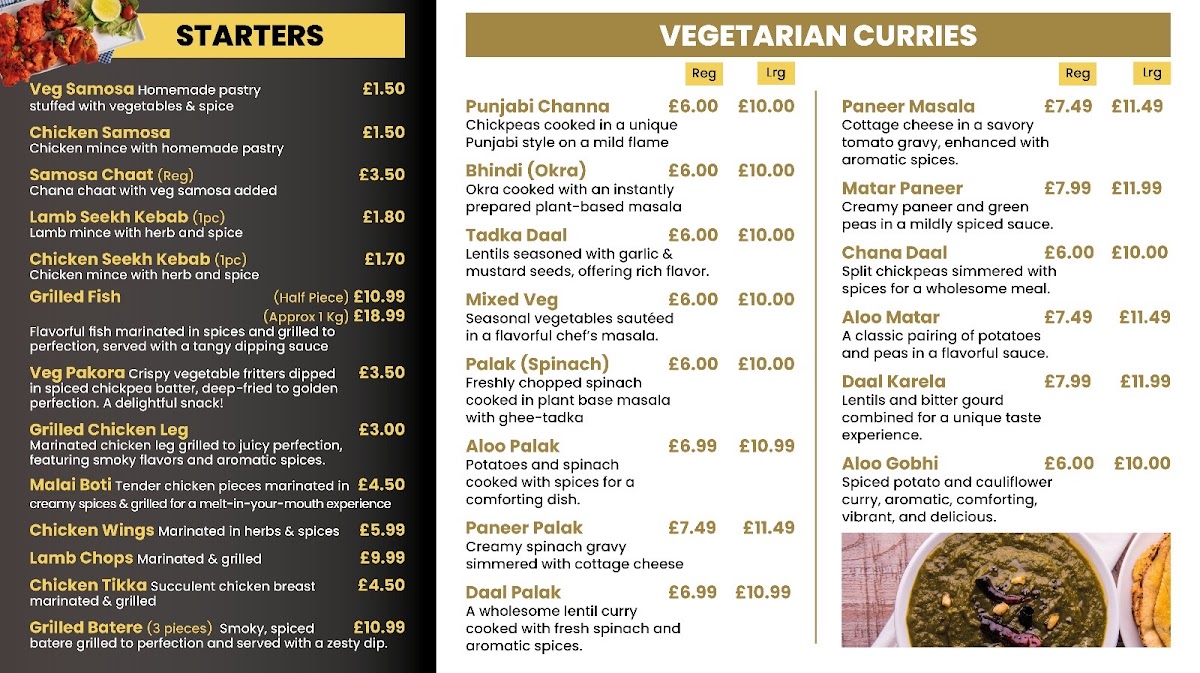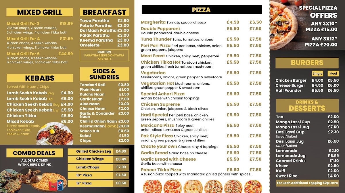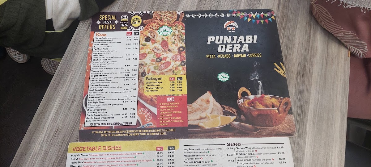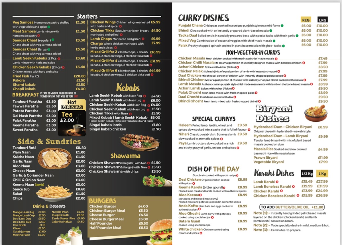 From a reviewer’s perspective, the menu at Punjabi Dera on Stockport Road is an impressive reflection of variety, comfort, and bold Punjabi flavors, making it a satisfying destination for takeaway dining. The breakfast section sets a traditional tone with hearty options such as Tandoori Paratha, Tawa Paratha, Aloo Paratha, Methi Paratha, and Dal Mash Paratha, perfect for a filling start to the day. Pizza lovers are equally well catered for, with both 10" Margherita Pizza, 10" Tuna Thunder Pizza, 10" Double Pepperoni Pizza, 10" Pepperoni Plus Pizza, 10" Vegetarian Pizza and their larger 12" counterparts offering familiar comfort with generous portions. The menu continues to diversify with fast-food favorites like Just Chicken Burger, Quarter Pounder Cheese Burger, and Half Pounder Cheese Burger, alongside classic kebabs such as Regular Chicken Shwarma, Large Chicken Shwarma, and Chicken Shwarma And Chips.